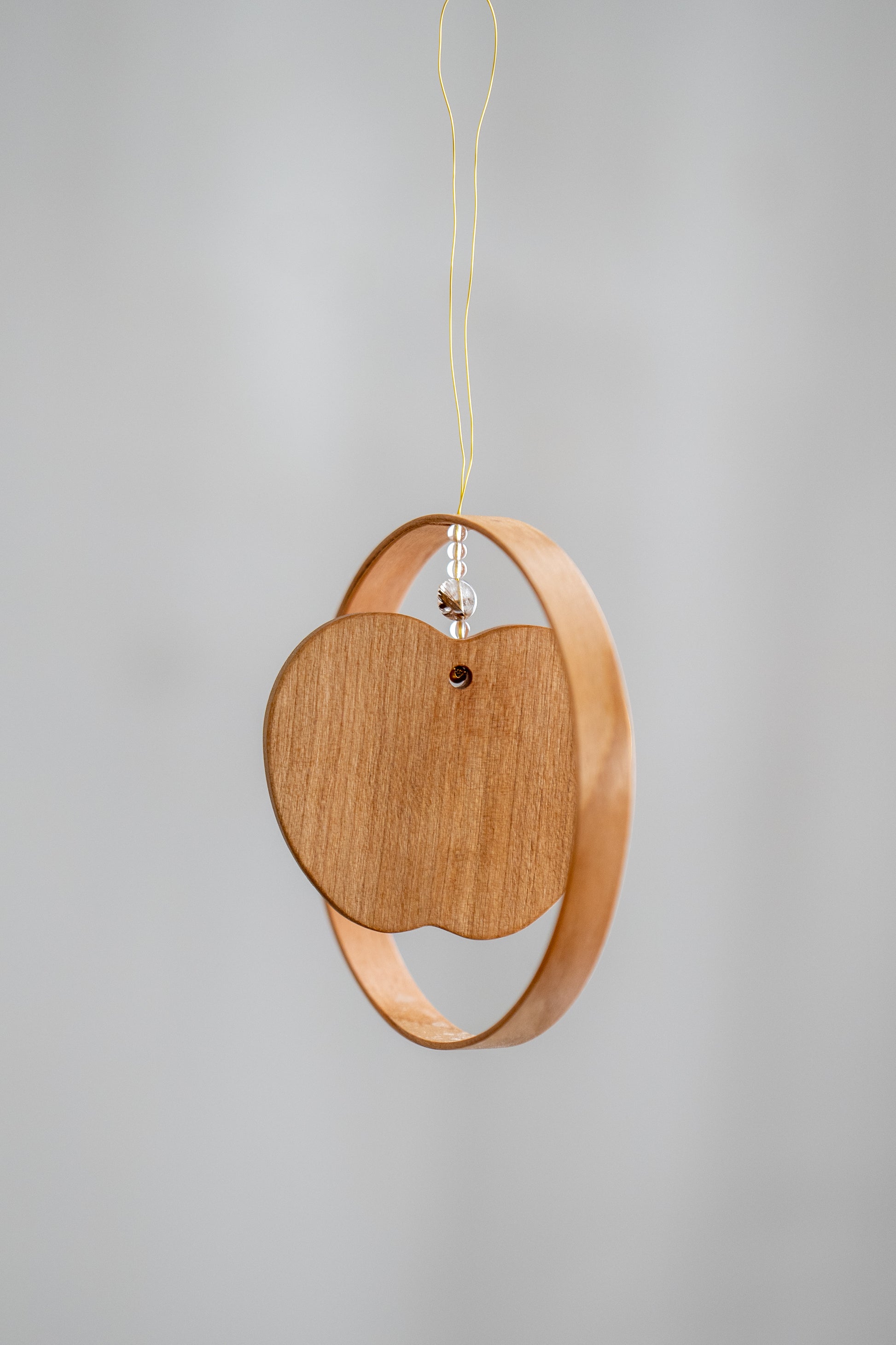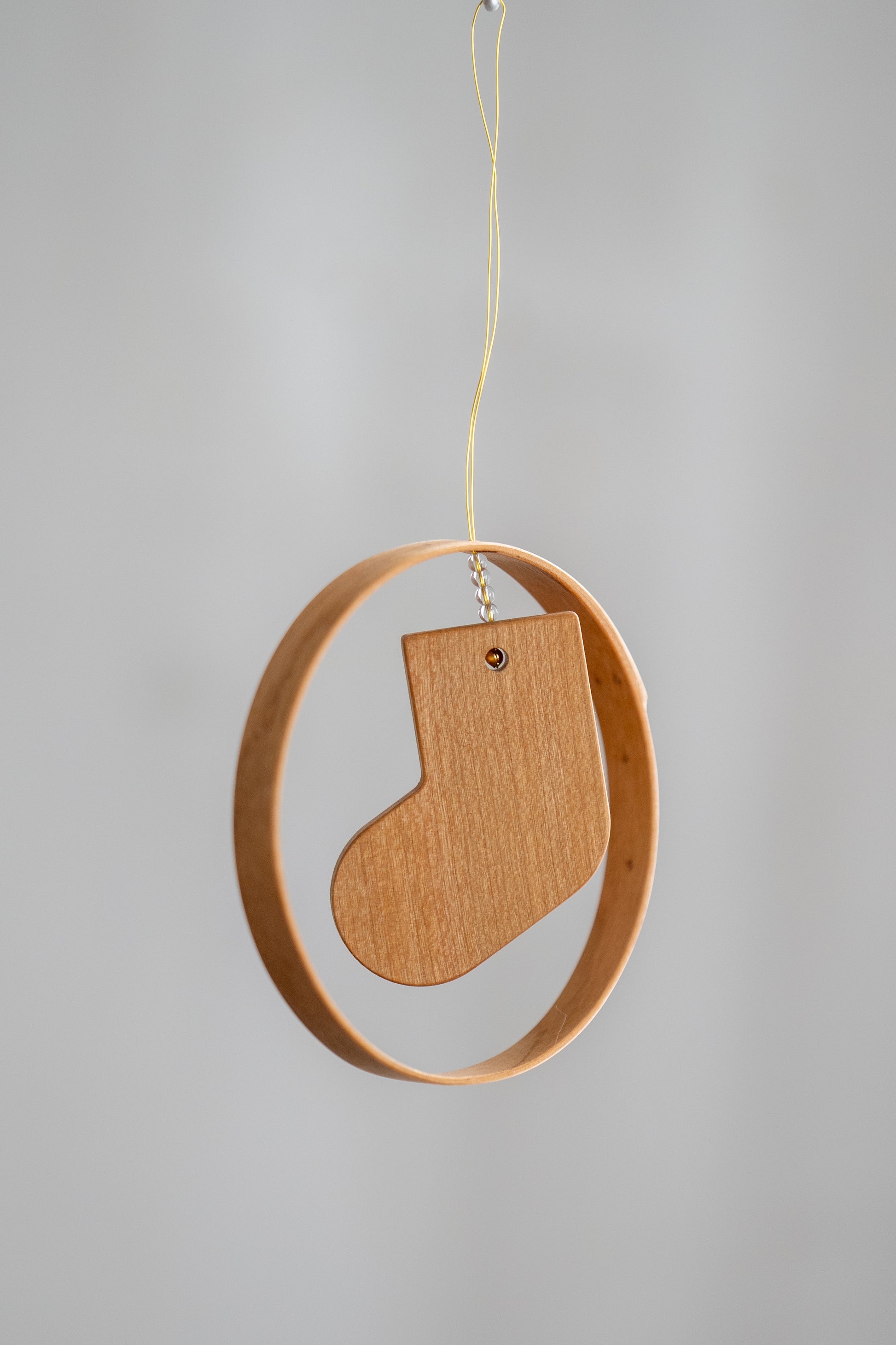 IFUJIならではの、曲げたリングのなかで靴下やジンジャーマンがゆったりと回ったら、そうひらめいたのが2024年のことでした。ボックスと同じ木材を使い、一つひとつ手作業で丁寧に仕上げました。あしらったビーズは水晶です。鮮やかな色彩は使用せず、IFUJI特有の木の色、染めの色にこだわり、経年変化を味わえ、どことなく牧歌的で素朴な、子供も大人も楽しめるオーナメントです。(画像のサンプルは一部、仕様変更となる予定です。)